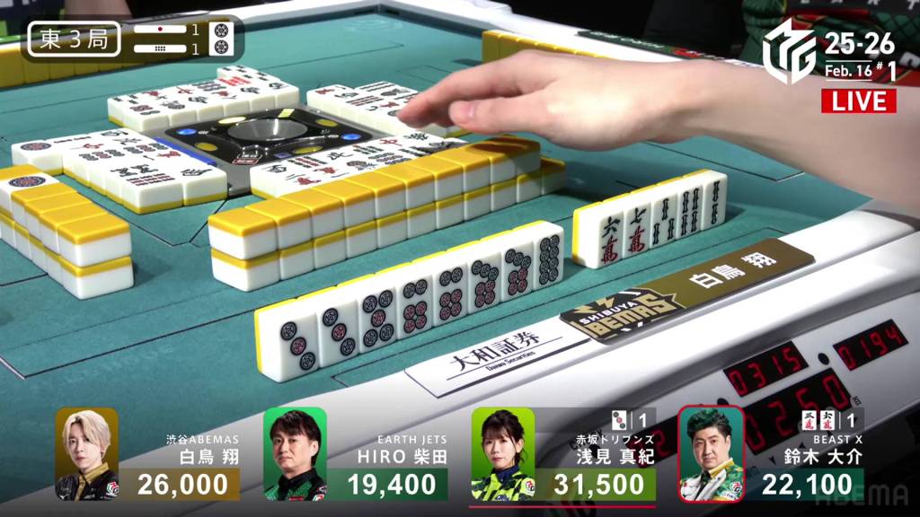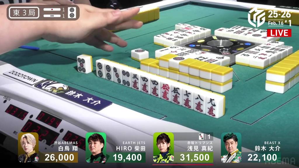 In E3-1, Daisuke is in 3rd place, 3,900 behind 2nd place Shiratori and 9,400 behind 1st place dealer Asami. A riichi stick and a honba are in the pot.