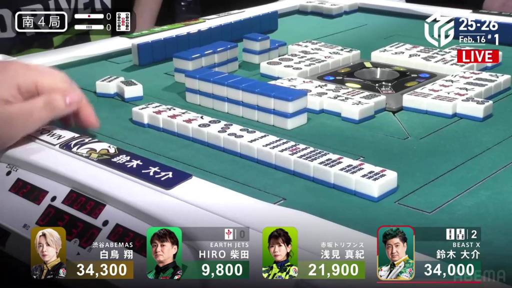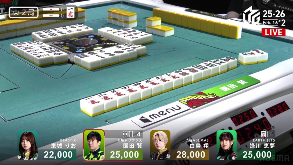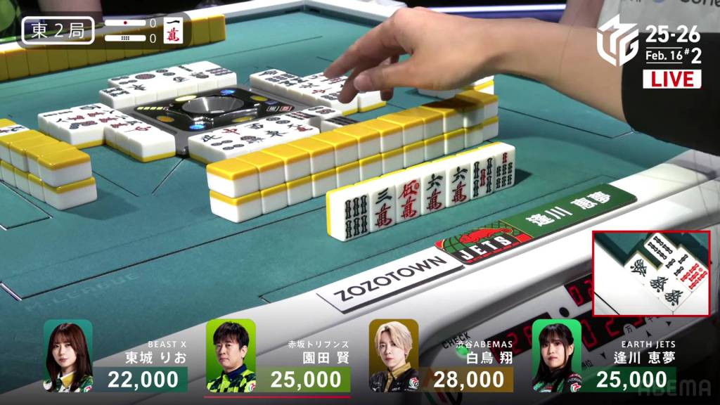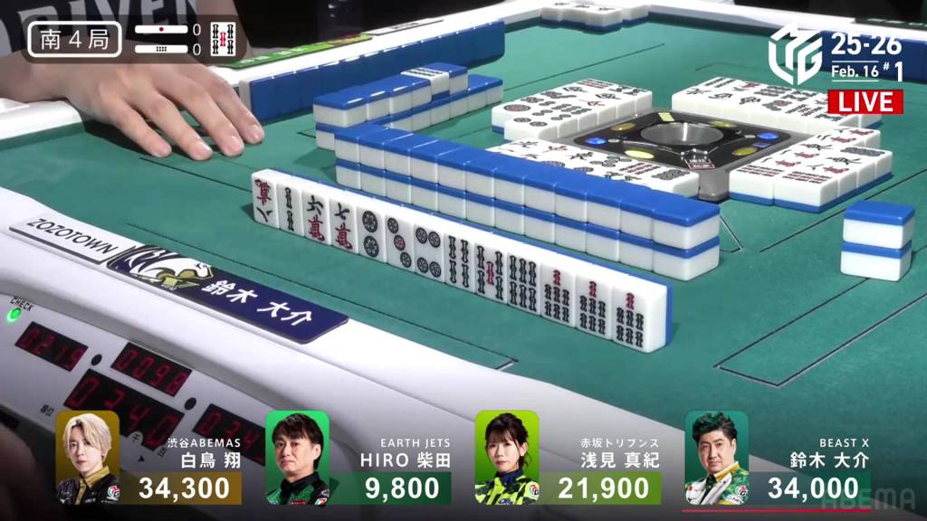 In E2-0, Sonoda is the dealer in a 2nd place tie, 3,000 behind 1st place Shiratori.