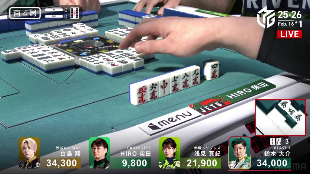 On Daisuke’s very nexct turn, he draws the 3m and wins the hand. Daisuke wins with Riichi/Ippatsu/Tsumo/Pinfu/Iipeikou/Dora 2/Aka 1 for a huge 4,000+100/8,000+100 baiman plus two riichi sticks, easily moving into 1st place.