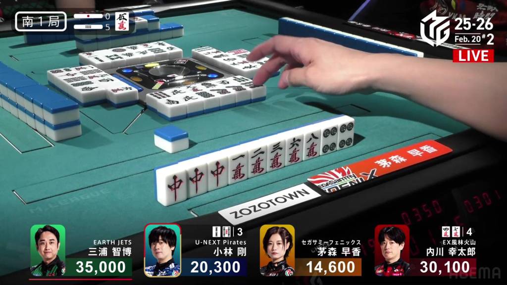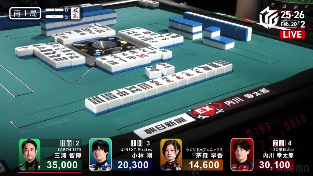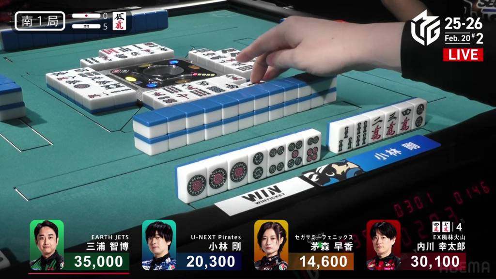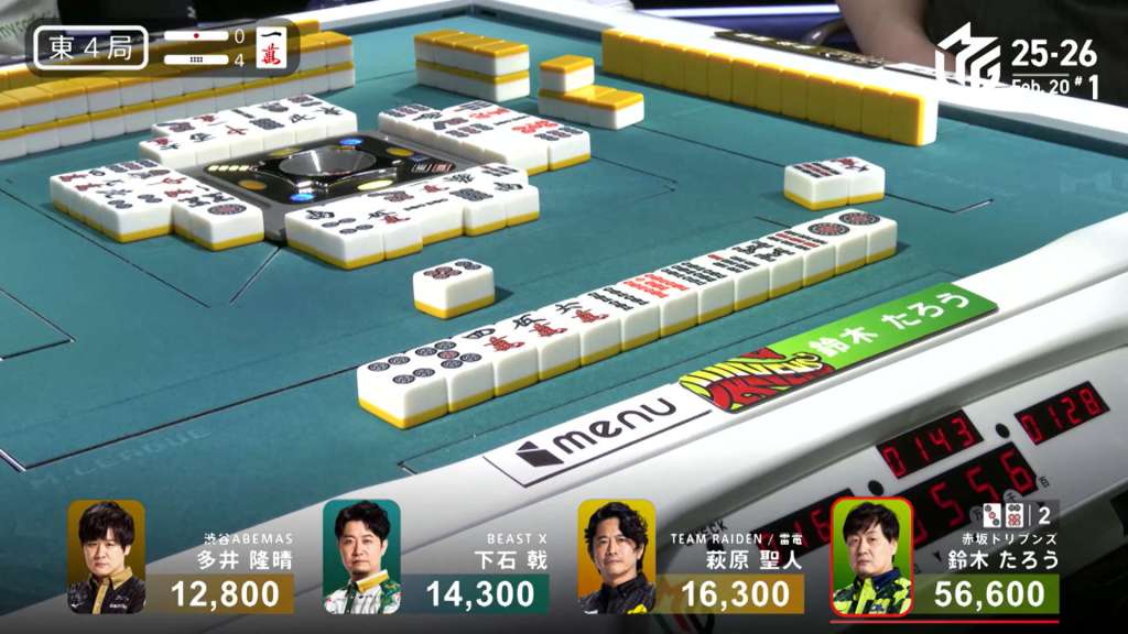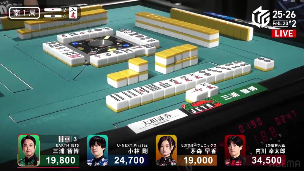 In S1-4, Miura is the dealer in 3rd place, 5,900 behind 2nd place Kobayashi and 14,700 behind 1st place Uchikawa. Two riichi sticks and four honba are in the pot, meaning that the next winner will get 3,200 in bonuses.