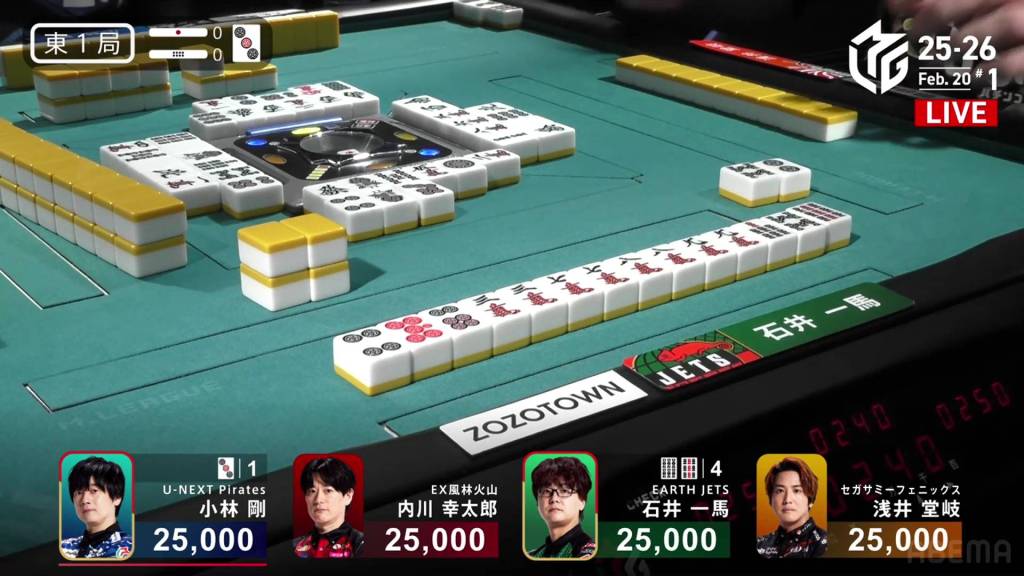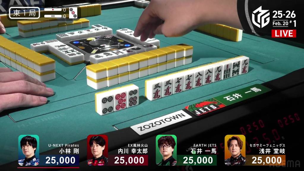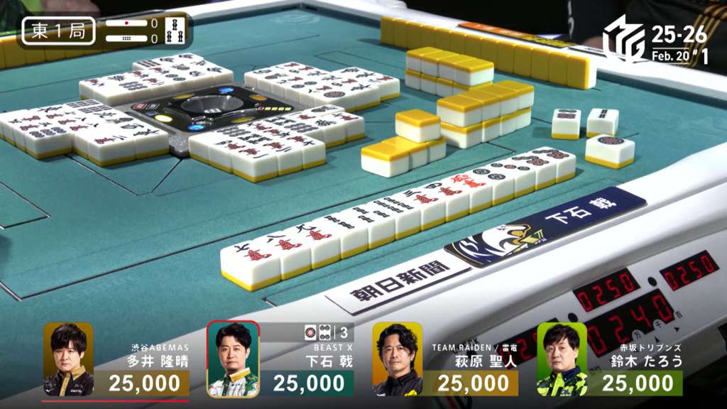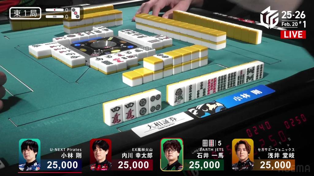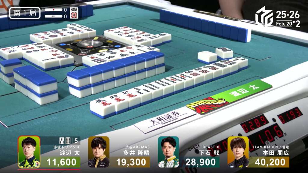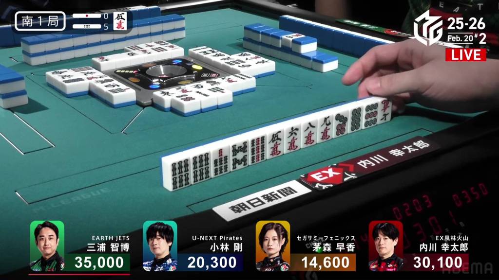 In S1-4, Miura is the dealer in 3rd place, 5,900 behind 2nd place Kobayashi and 14,700 behind 1st place Uchikawa. Two riichi sticks and four honba are in the pot, meaning that the next winner will get 3,200 in bonuses.