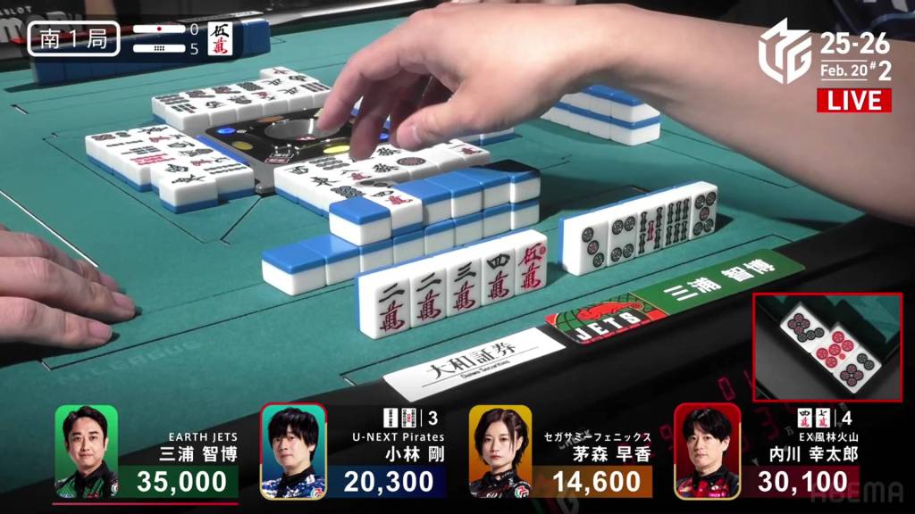 In S1-5, Uchikawa is in 2nd place after being passed by Miura the previous hand. Uchikawa trails Miura by 4,900.