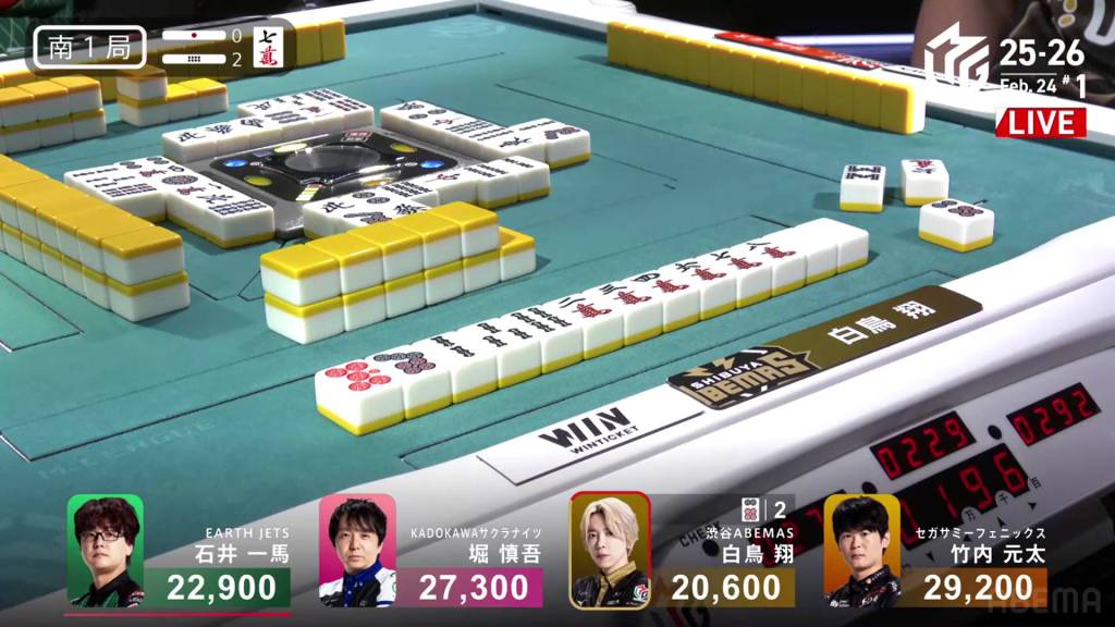 In S4-0, Kazuma is in 4th place and is 5,600 behind 1st place Shibukawa. To take 1st place, Kazuma needs a 2/50 or 3/25 direct hit, a 3/30 tsumo, or a 3/50 or 4/25 ron.