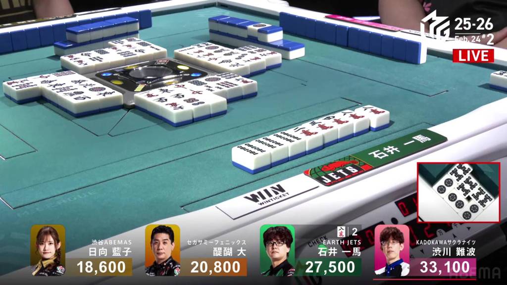 By the middle of the second row, Kazuma is iishanten with his tanyao. A turn later, he gets to tenpai on a 7m kanchan, but none remain in the wall. Looking for possible improvements, he calls pon at the end of the row and switches to an 8m tanki. Though improvement is what he wants, he will also accept a winning tile. In the middle of the third row, Kazuma draws the 8m and wins the hand. Kazuma wins with Tanyao/Dora 3 for 2,000/4,000, finishing the game in 1st place.