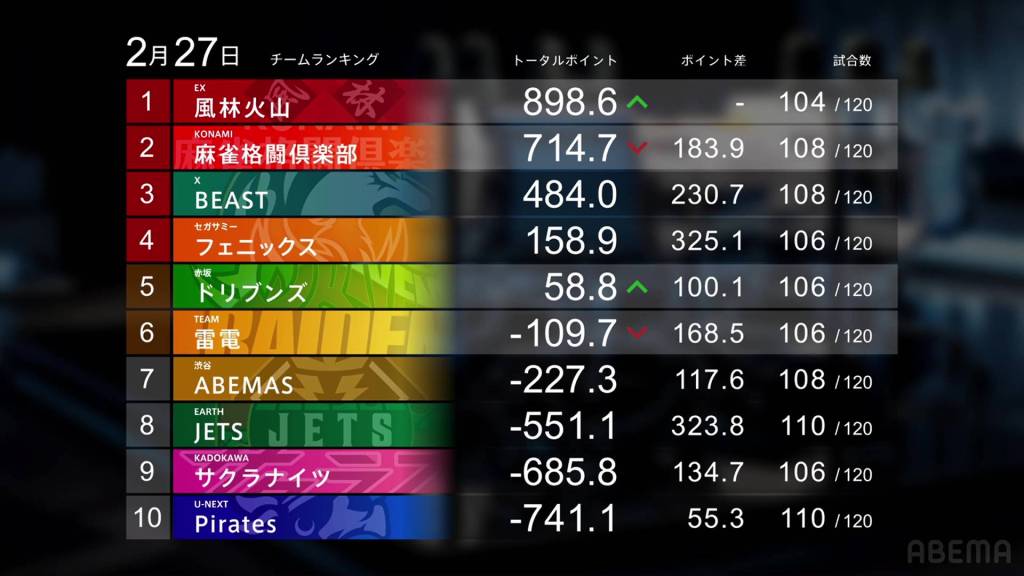 The Shibuya Abemas, Earth Jets and Kadokawa Sakura Knights fell. A 2nd and 4th place caused the team to lose ground on a playoff spot. The Earth Jets had Kazuma redeming himself with a 1st after a 4th, but a 3rd and 4th on Thursday kept them down. And the Kadoawa Sakura Knights played four games and couldn’t get a 1st place in a single one.