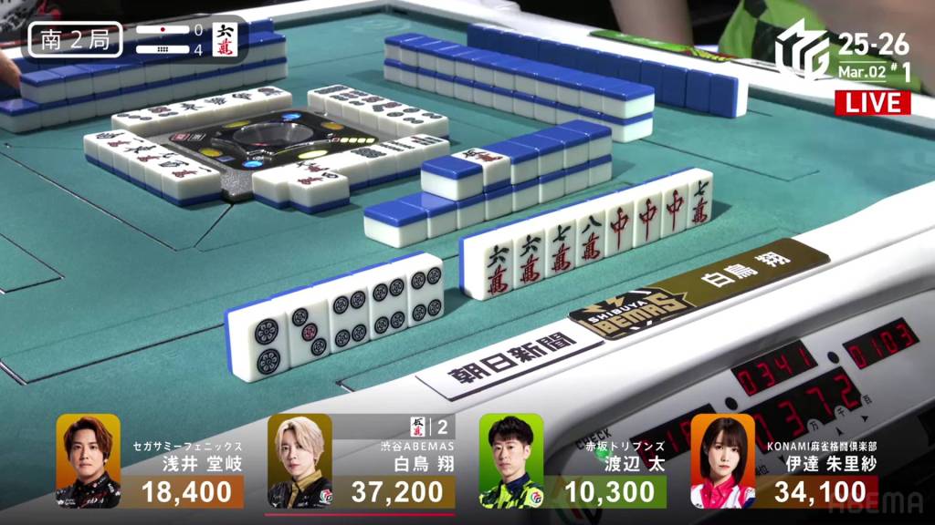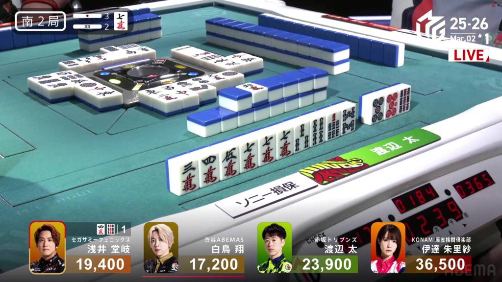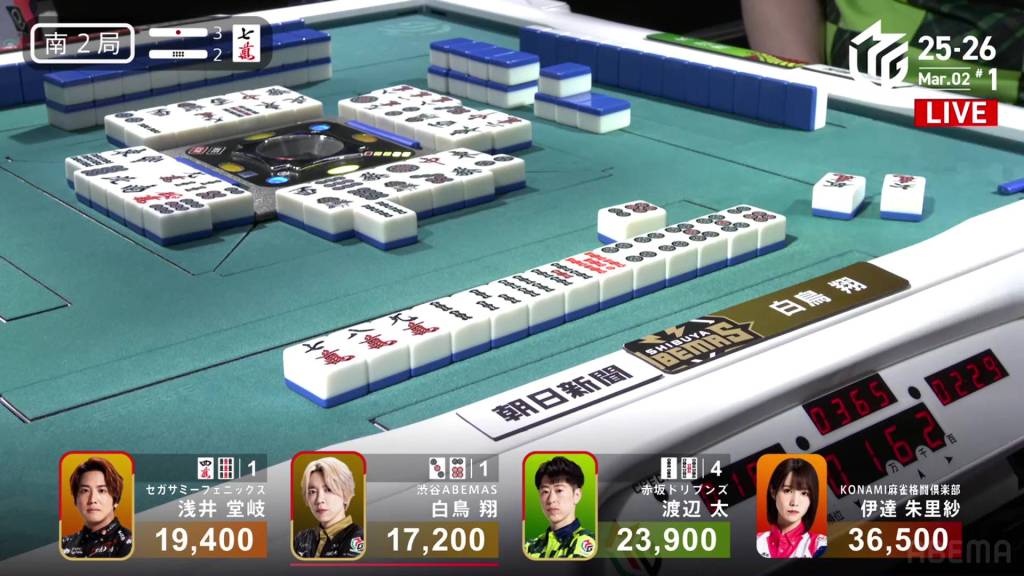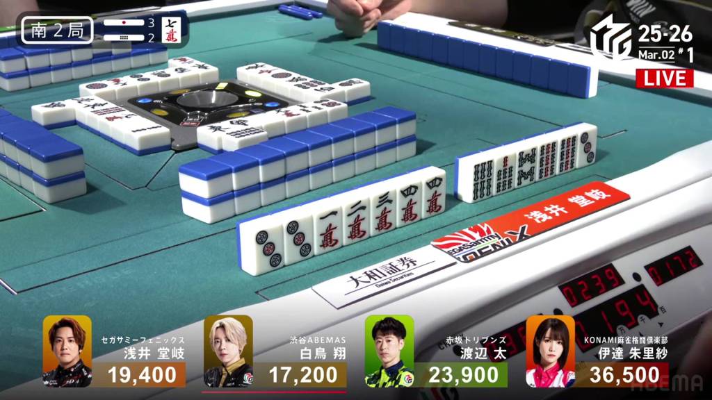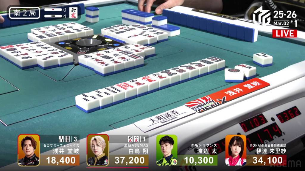 In S2-2, Shiratori is the dealer in 4th place, 2,200 behind 3rd place Takaki, 6,700 behind 2nd place Futoshi and 19,300 behind 1st place Date. With three riichi sticks and two honba in the pot, it’s a great opportunity to close the gap. .