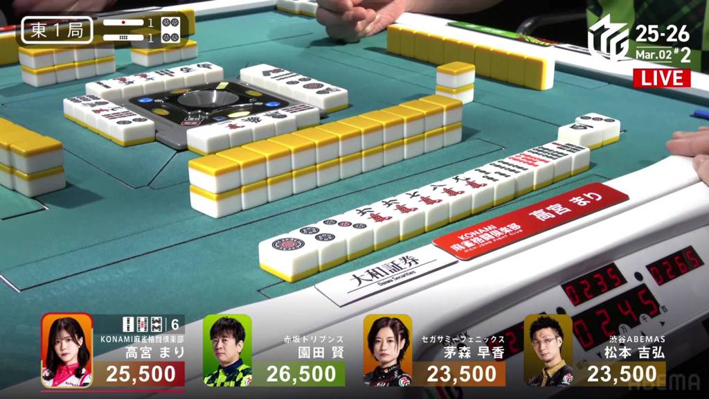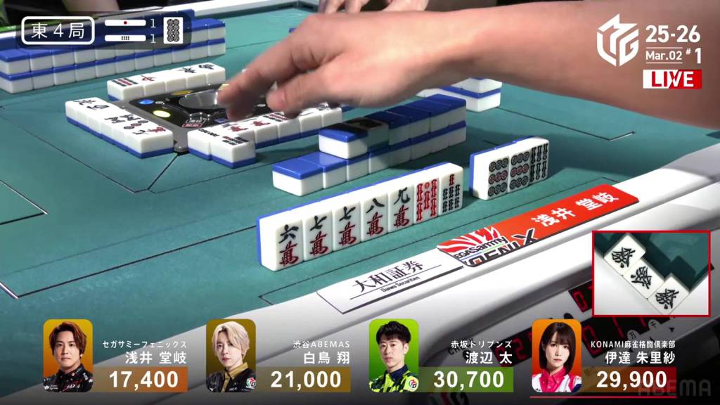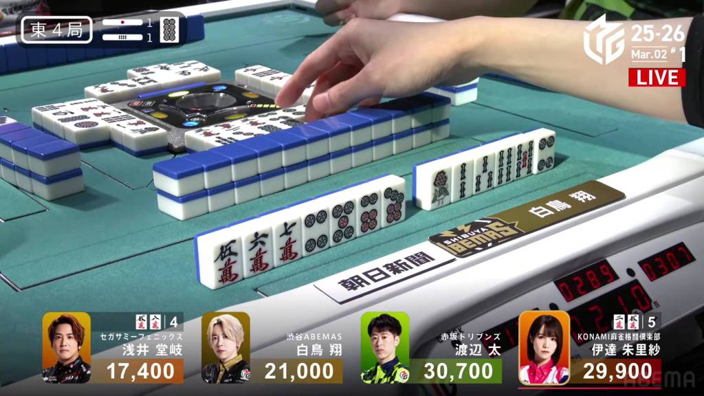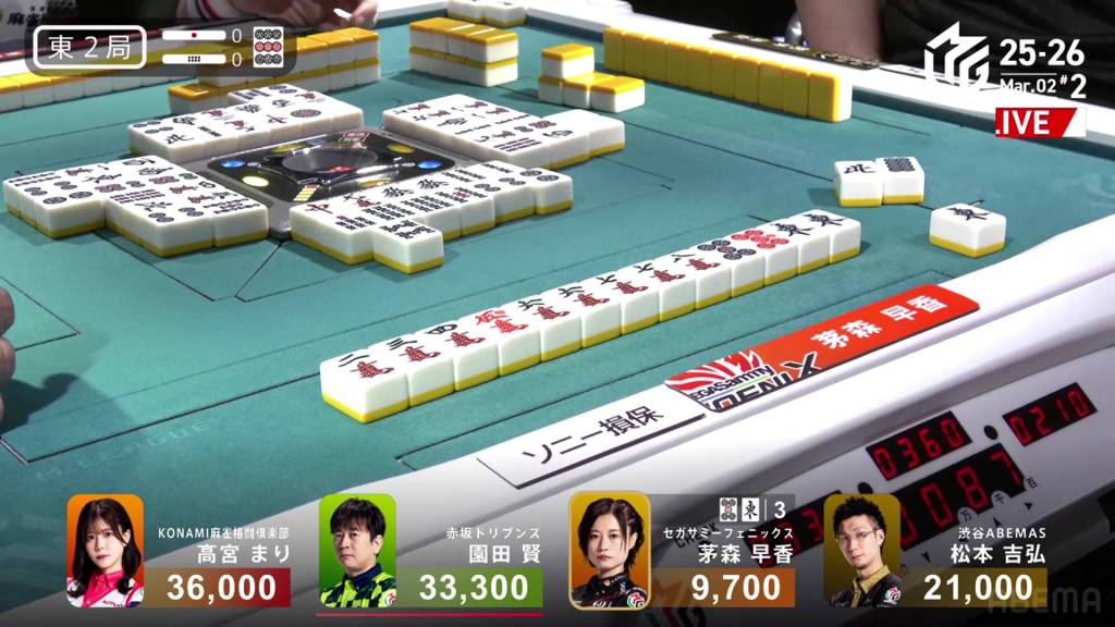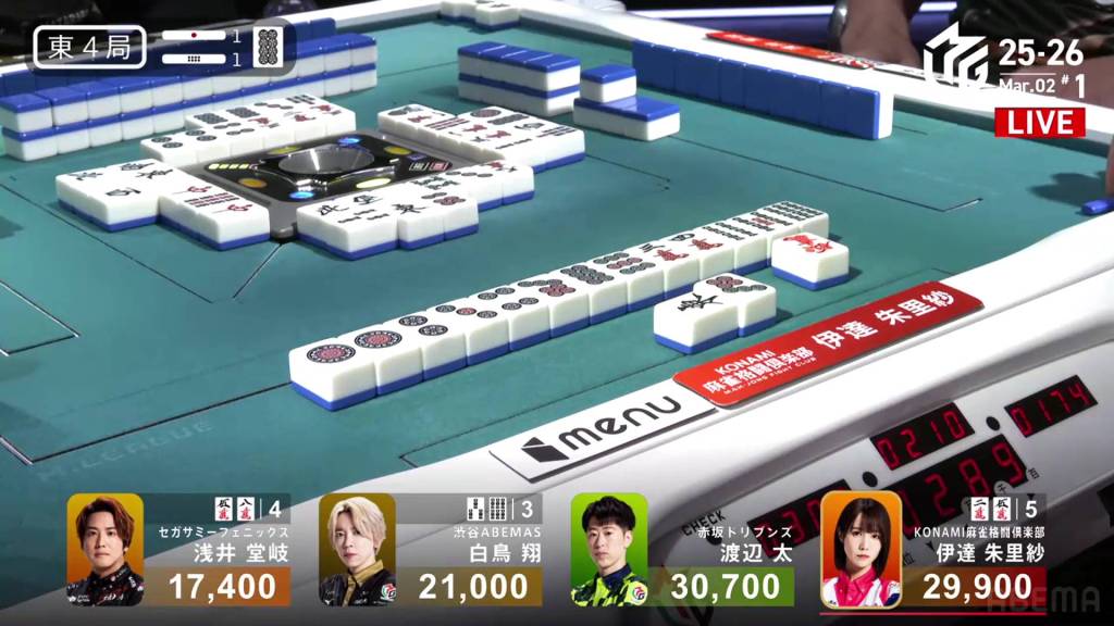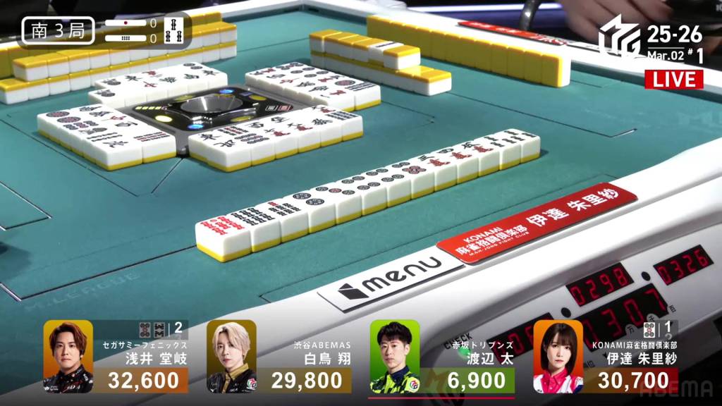 In S2-2, Shiratori is the dealer in 4th place, 2,200 behind 3rd place Takaki, 6,700 behind 2nd place Futoshi and 19,300 behind 1st place Date. With three riichi sticks and two honba in the pot, it’s a great opportunity to close the gap. .