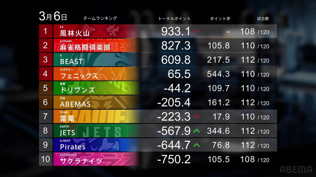 The Konami Mahjong Fight Club, U-Next Pirates, EX Furinkazan and Shibuya Abemas also had gains. They only played on Monday, but the Konami Mahjong Fight Club had a daily double from Date and Takamiya to inch them closer to 1st overall. The U-Next Pirates escape 10th place after a 54,000 win by Mizuhara followed by a 2nd by Nakabayashi, pushing them more than 100.0pts above 10th. The EX Furinkazan had Uchikawa playing three games, getting a 1st, 2nd and a 3rd, pushing them above +900.0pts. And the Shibuya Abemas had a 2nd and a 1st from Shiratori to put them back into 6th place and a playoff spot.