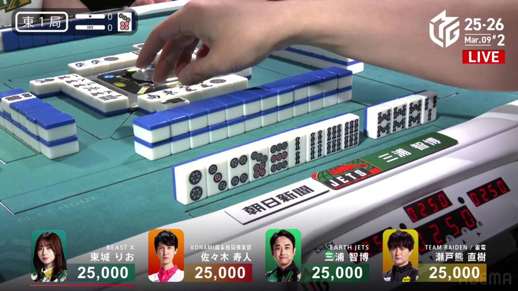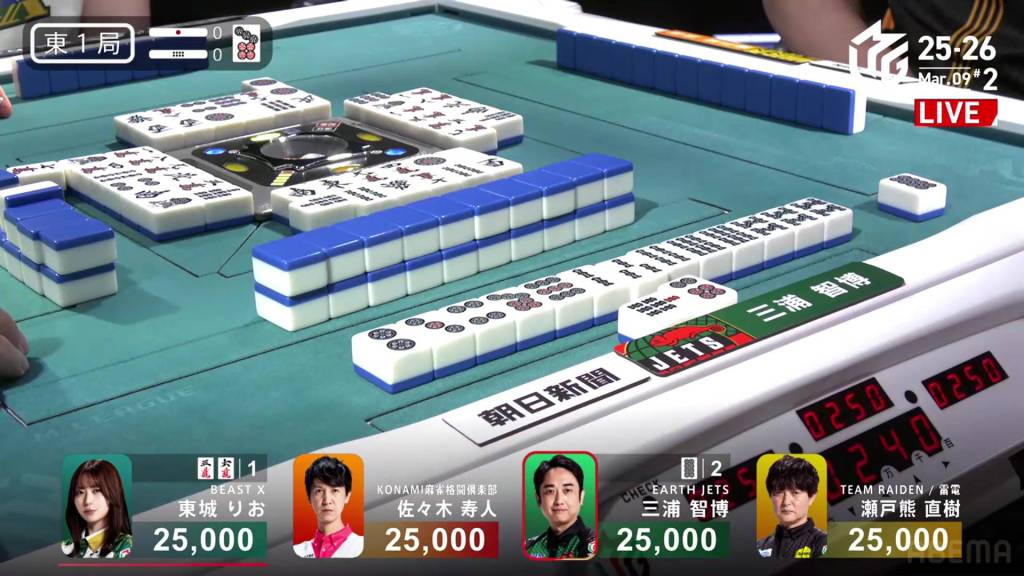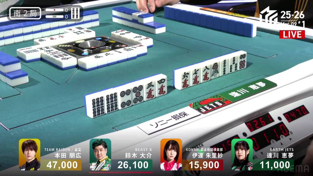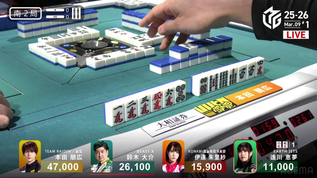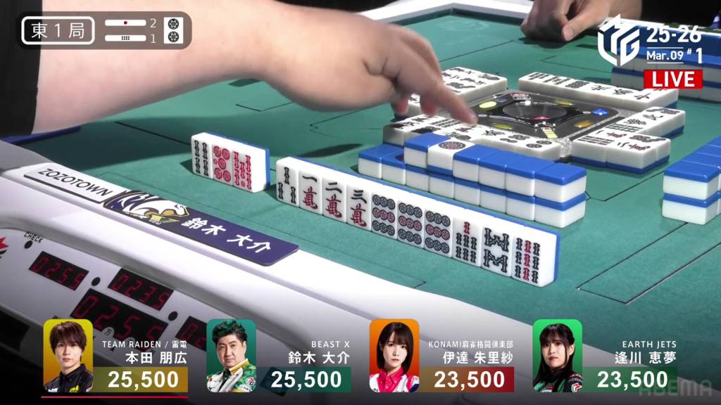 In E1-1, Honda is the starting starting dealer tied for 1st place, being in a riichi battle with Daisuke and the hand going to a draw. As a result, the two riichi sticks will go to the next winner.