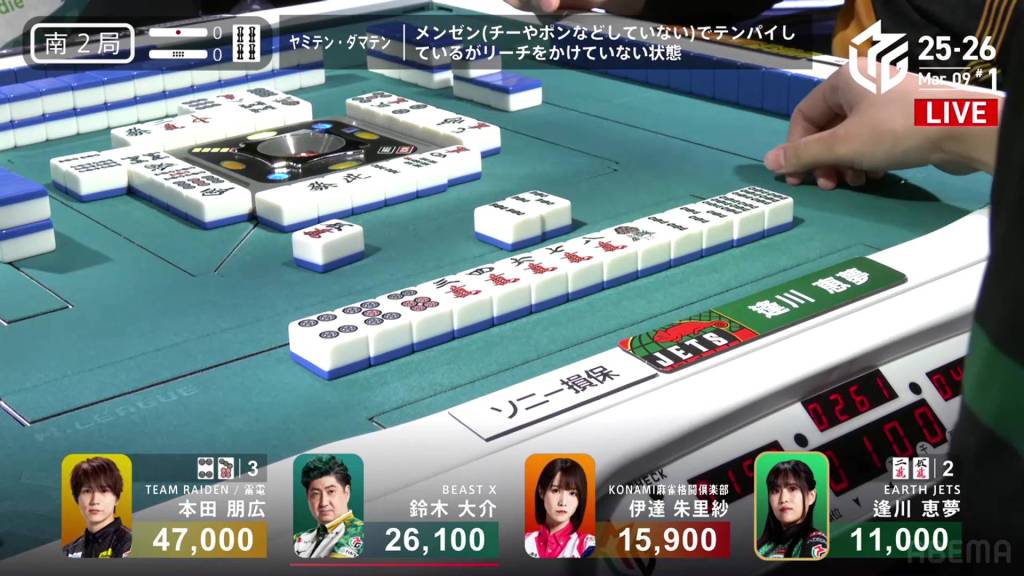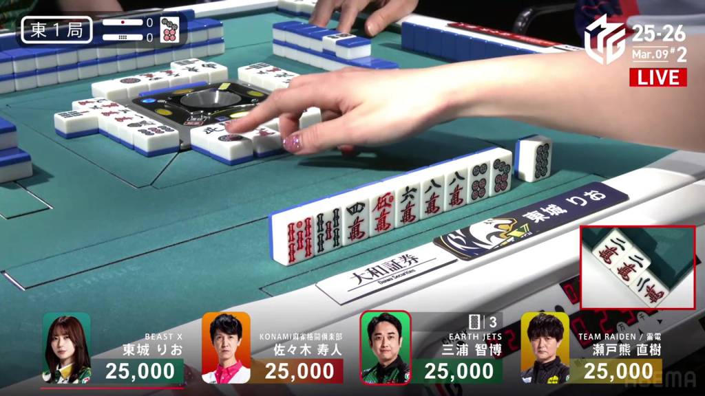 Because of Honda’s calls, Daisuke got his draws faster. In the middle of the second row, Daisuke is the first to tenpai and calls riichi on a 5p tanki.