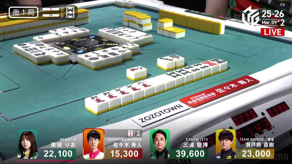 In S1-0, Hisato is in 4th place, 6,800 behind 3rd place dealer Tojo, 7,700 behind 2nd place Setokuma and 24,300 behind 1st place Miura.