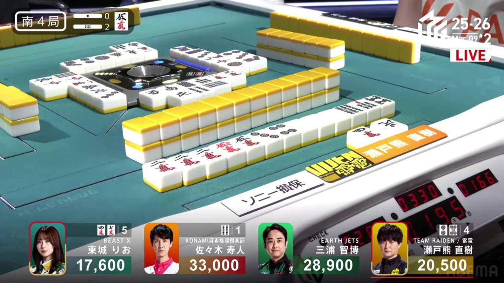 In S4-2, Setokuma is the dealer in 3rd place, 8,400 behind 2nd place Miura and 12,500 behind 1st place Hisato. With two honba, a dealer mangan would be enough to move into 1st place.