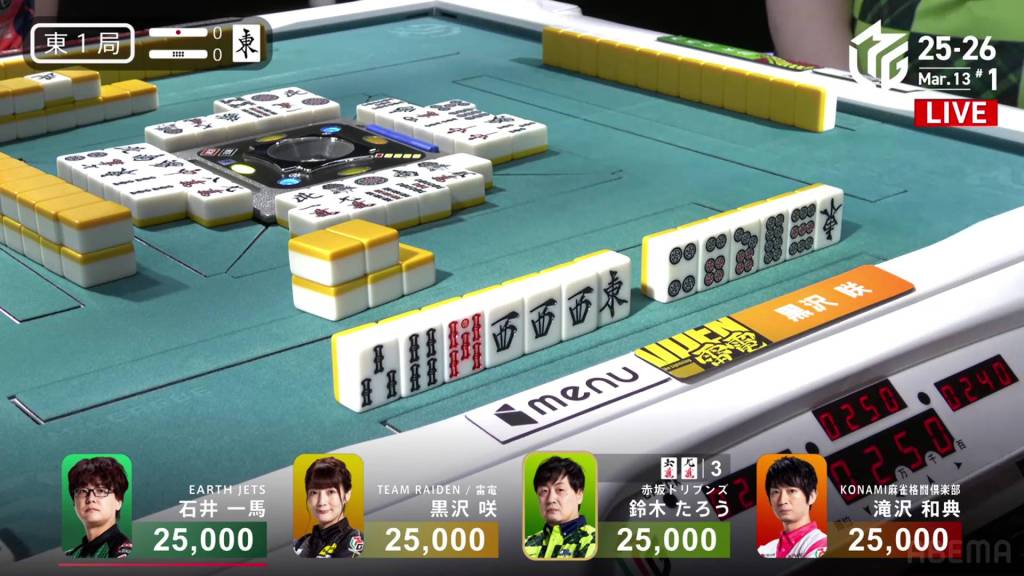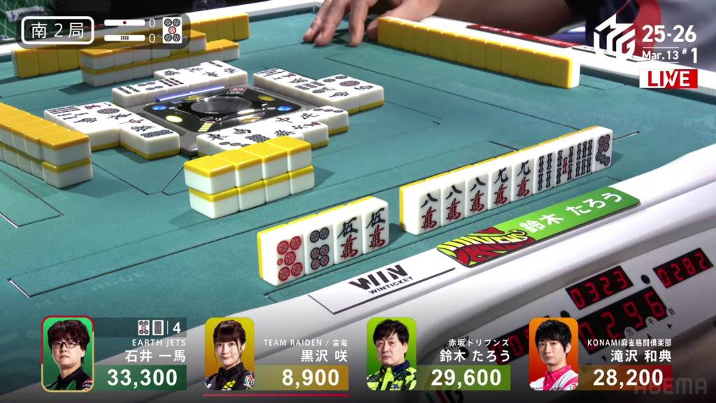 On Kurosawa’s second-last turn, she discards the 6m and deals into Taro. Taro wins the hand with Riichi/Pinfu/Sanshoku for 8,000 plus a riichi stick.