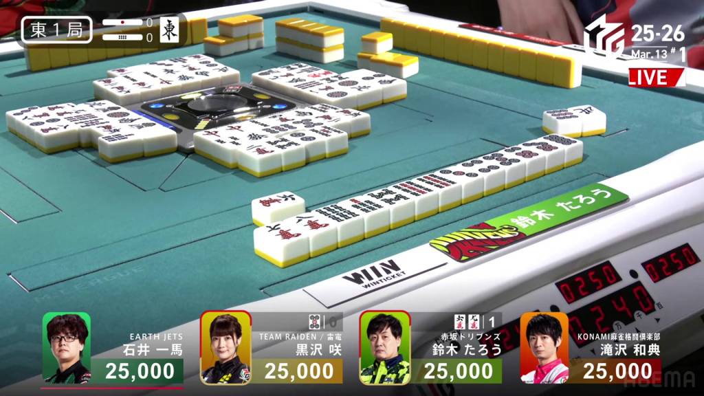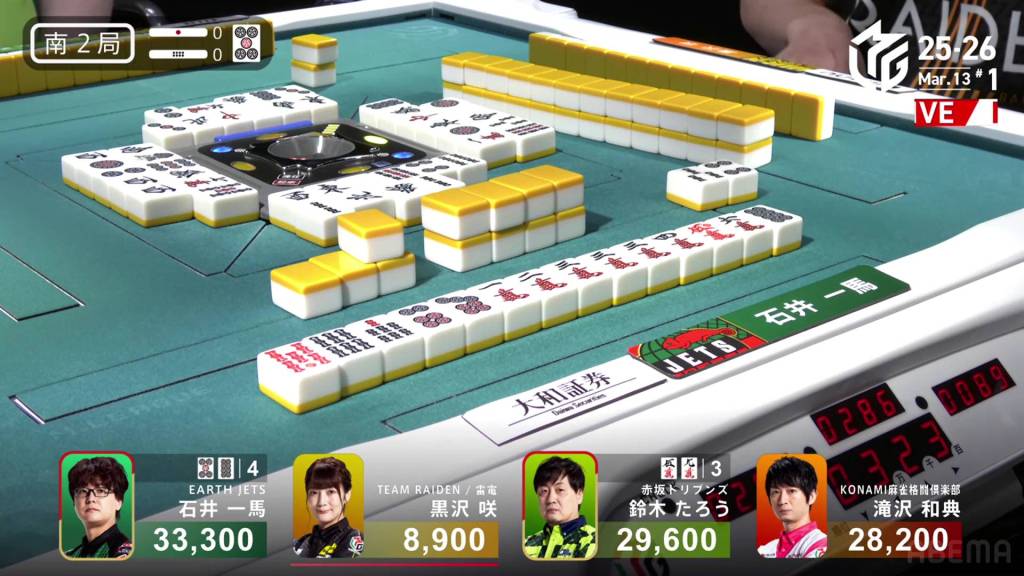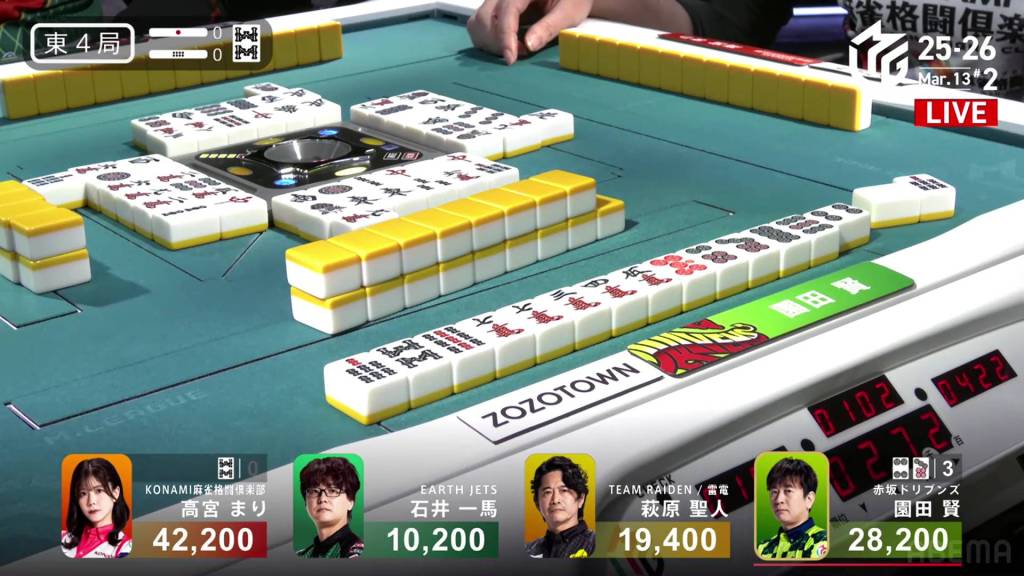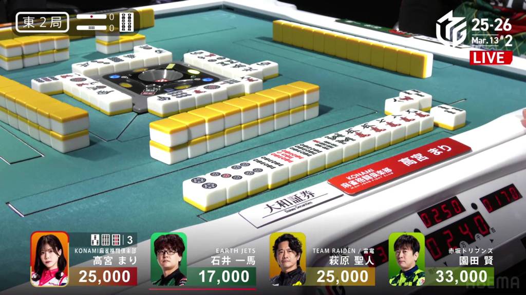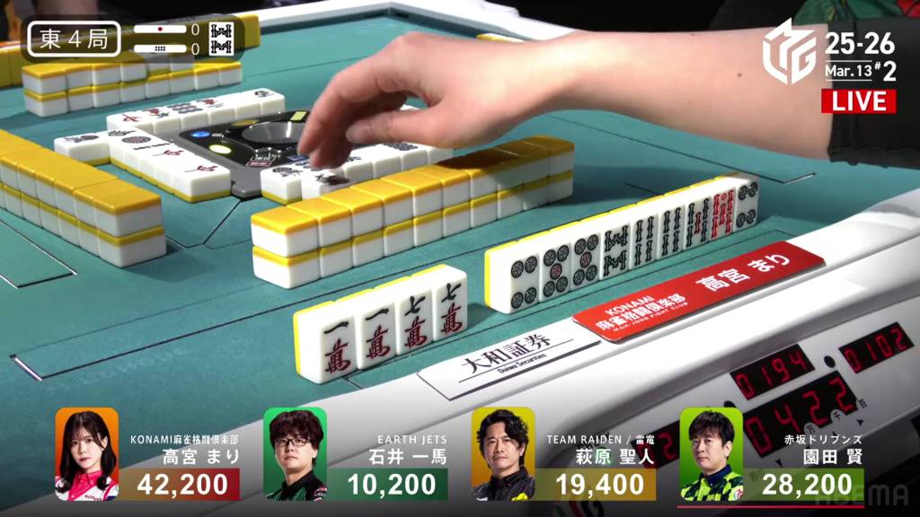 In E4-0, Sonoda is the dealer in 2nd place, 14,000 behind 1st place Takamiya.
