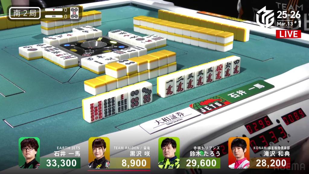 With no riichi in play, there’s no pressure put on Sonoda, allowing him to push with ease. At the start of the third row, he gets to tenpai and calls riichi on a 47p ryanmen, guaranteed at least a mangan. On his very next turn, Sonoda gets the 4p and wins the hand. Sonoda wins with Riichi/Ippatsu/Tsumo/Pinfu/Dora 1/Aka 1 for 6,000+100 all, easily moving into 1st place.