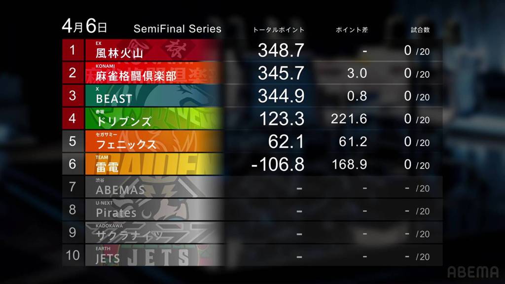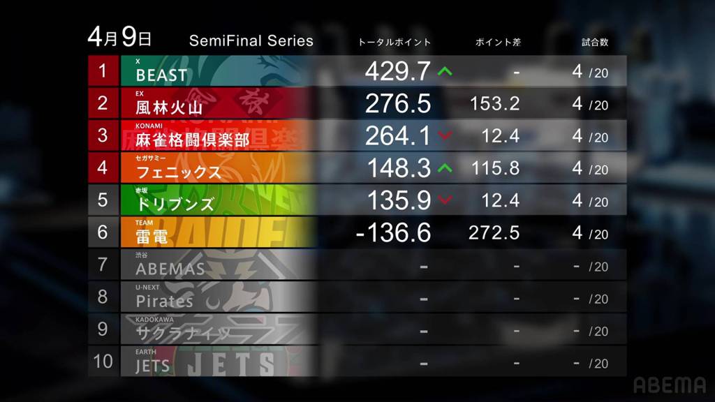 Rounding out the gainers is the Akasaka Drivens. Despite some mediocre games, their real saving grace was Futoshi’s big 70,300 win on Thursday, the biggest win so far these semifinals. And though they fall into 5th place overall, they still remain competitive for a playoff spot.
