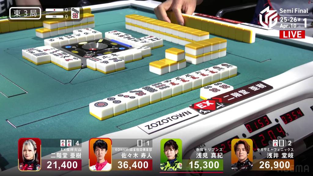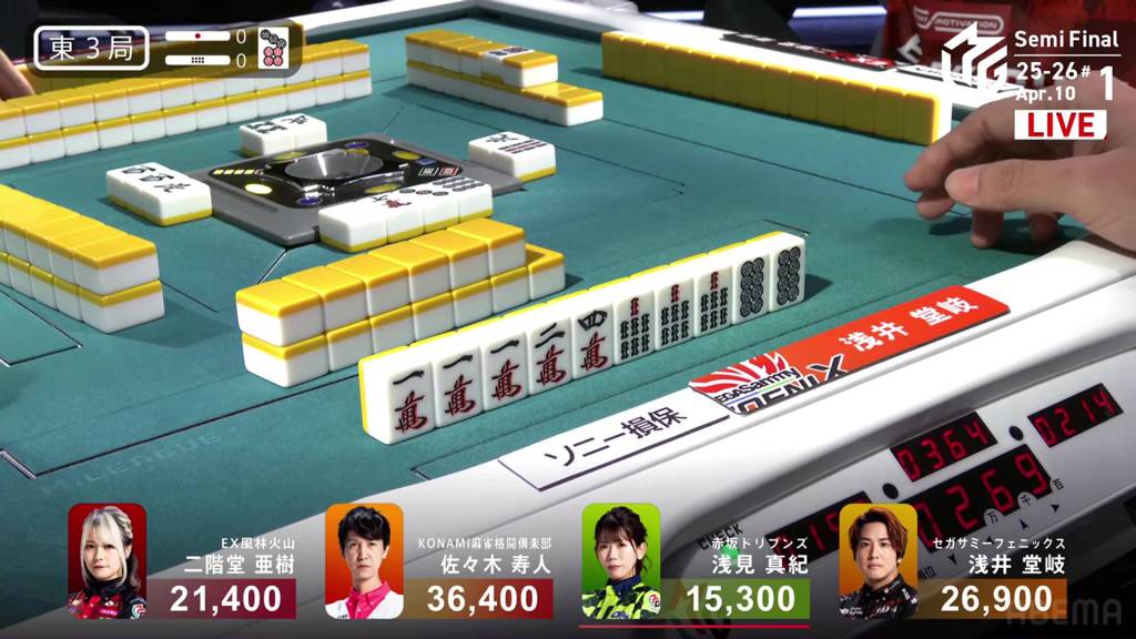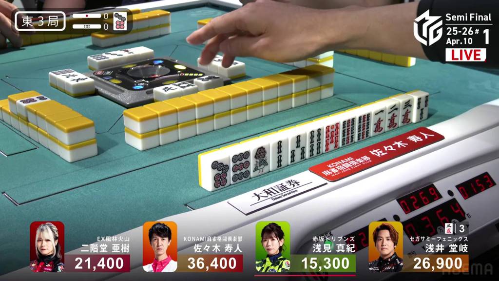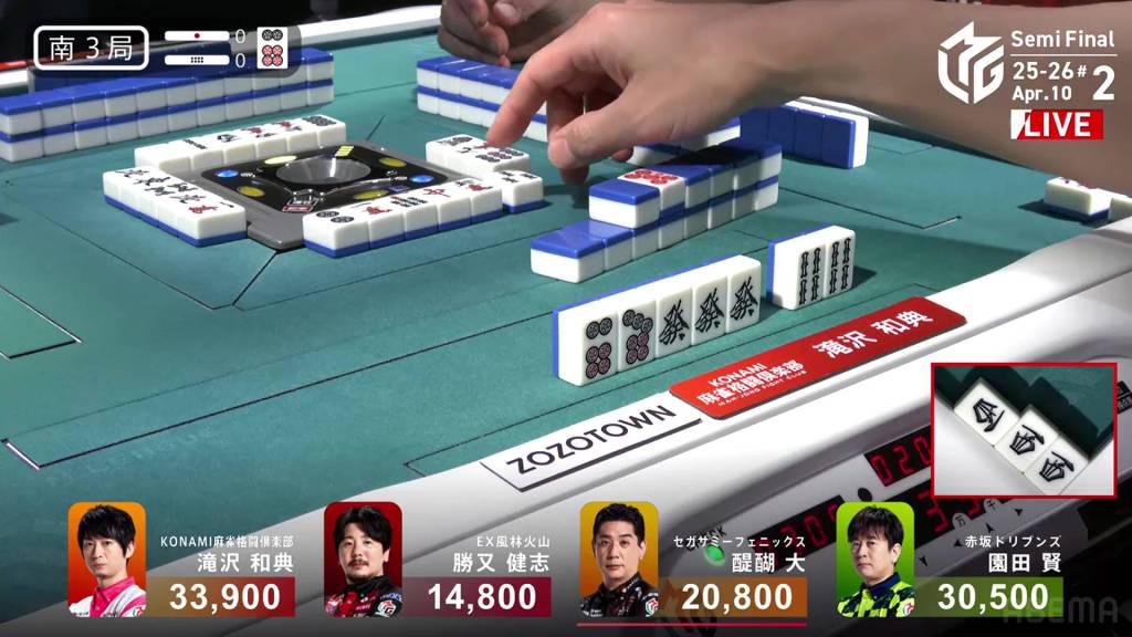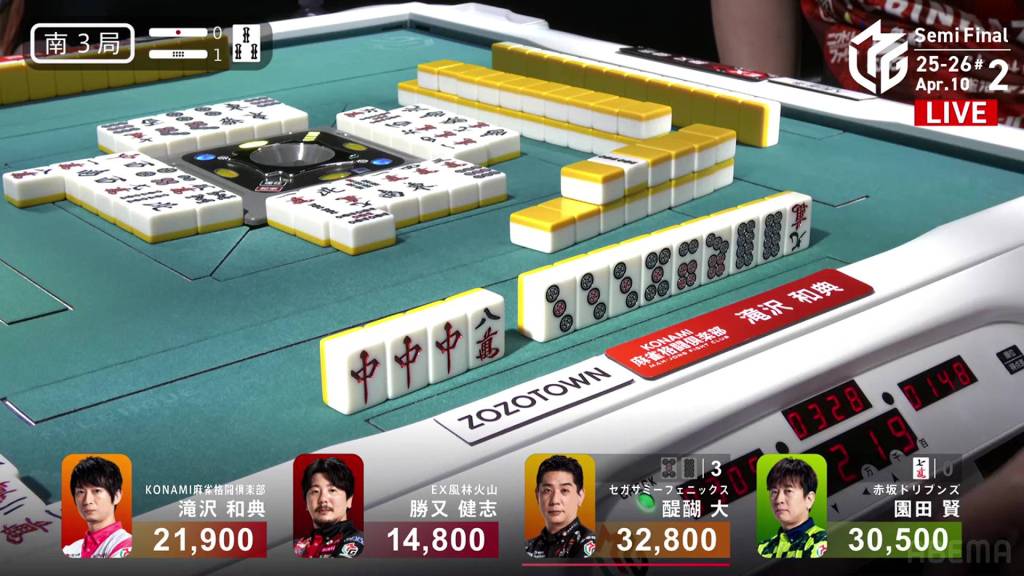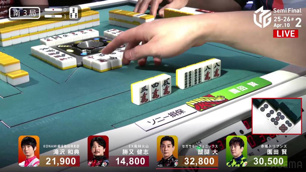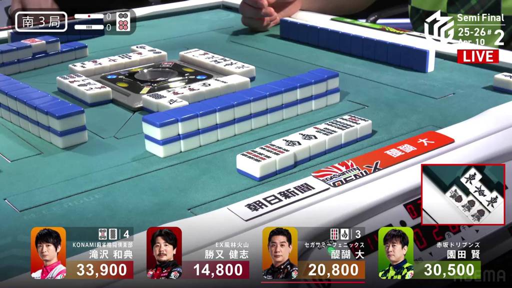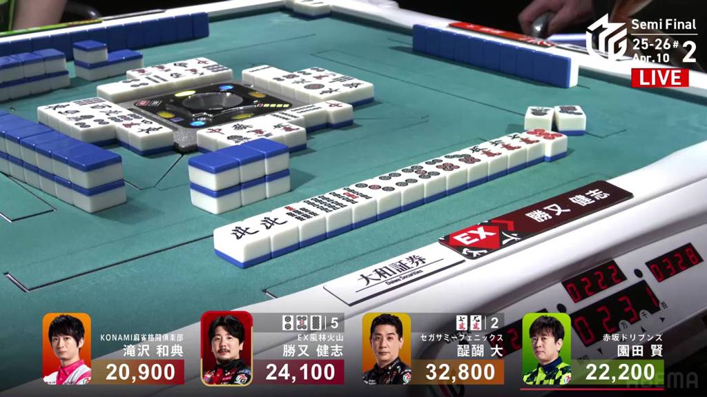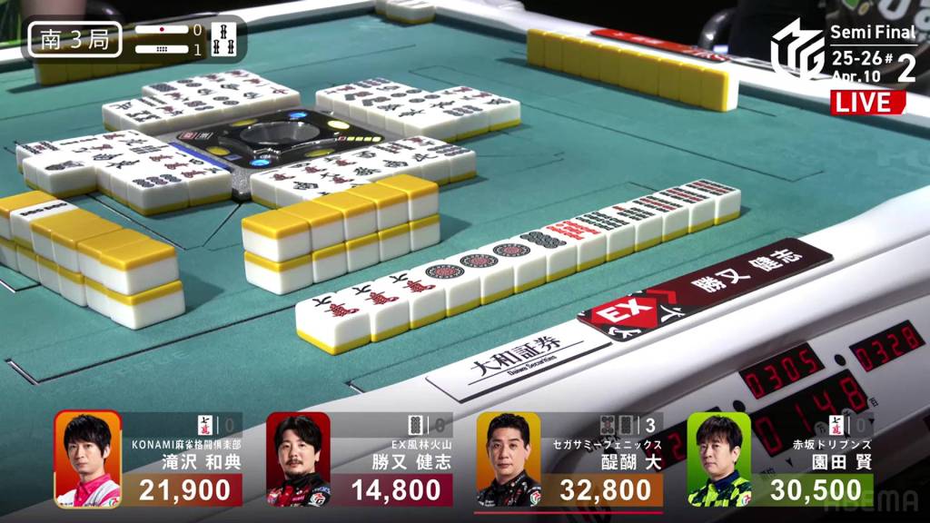 In S3-1, Katsumata is in 4th place, 7,100 behind 3rd place Takizawa, 15,700 behind 2nd place Sonoda and 18,000 behind 1st place Daigo. With no more dealership left, Katsumata only has two more hands to make any sort of comeback.