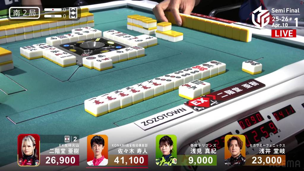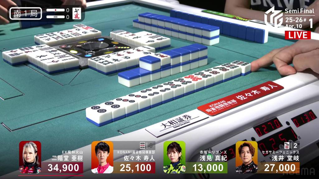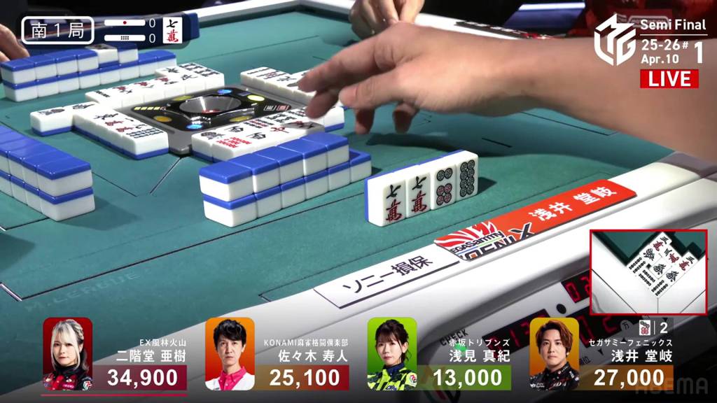 In S2-0, Aki is now in 2nd place and 14,200 behind 1st place dealer Hisato after Hisato’s big baiman win the previous hand.