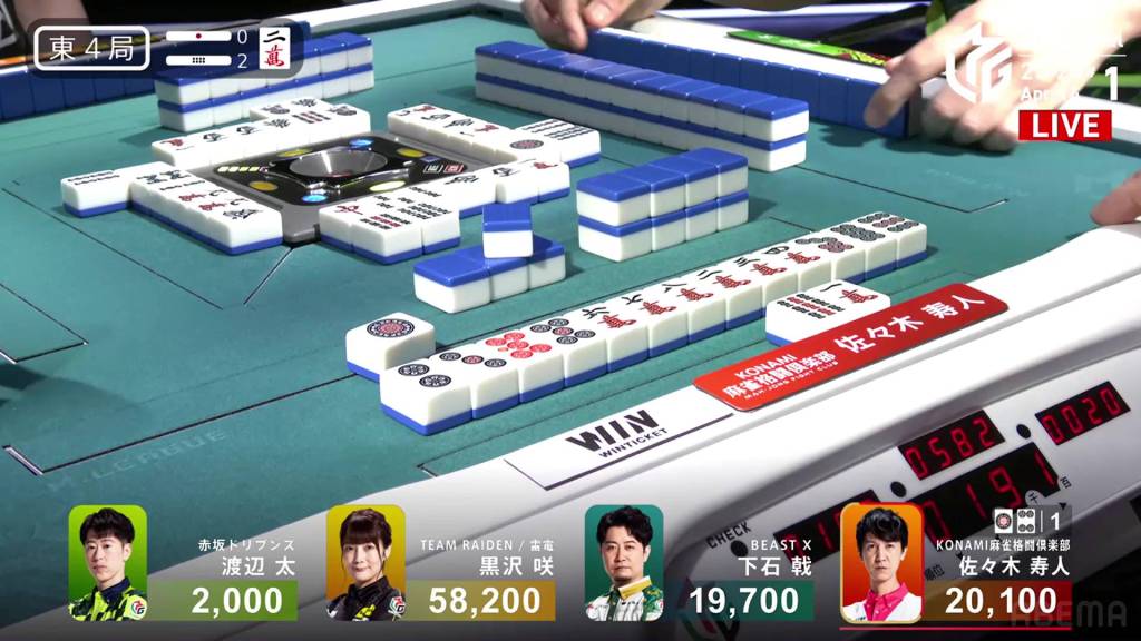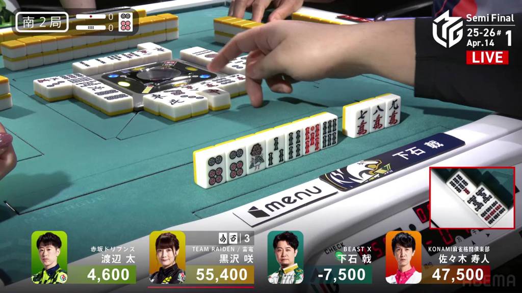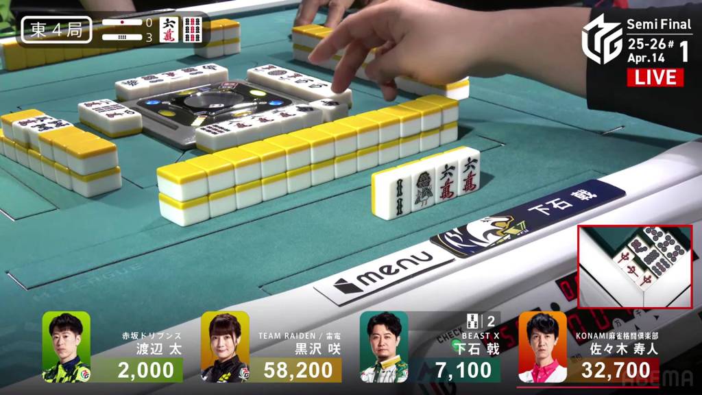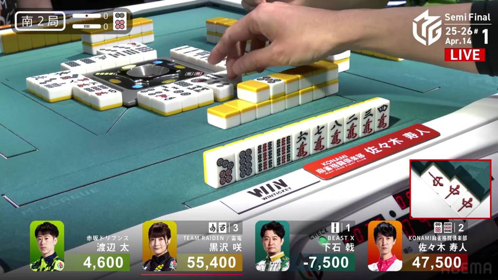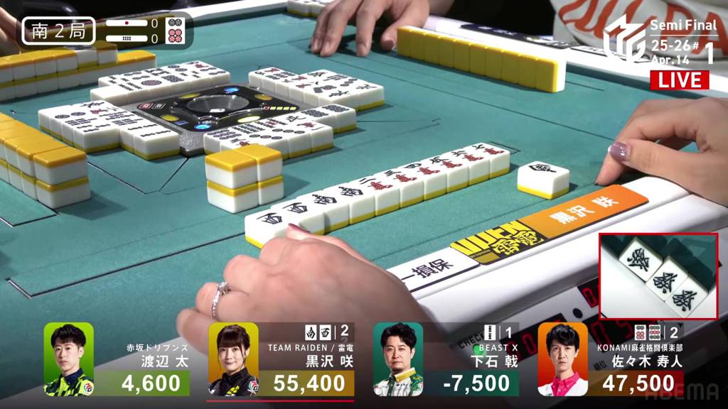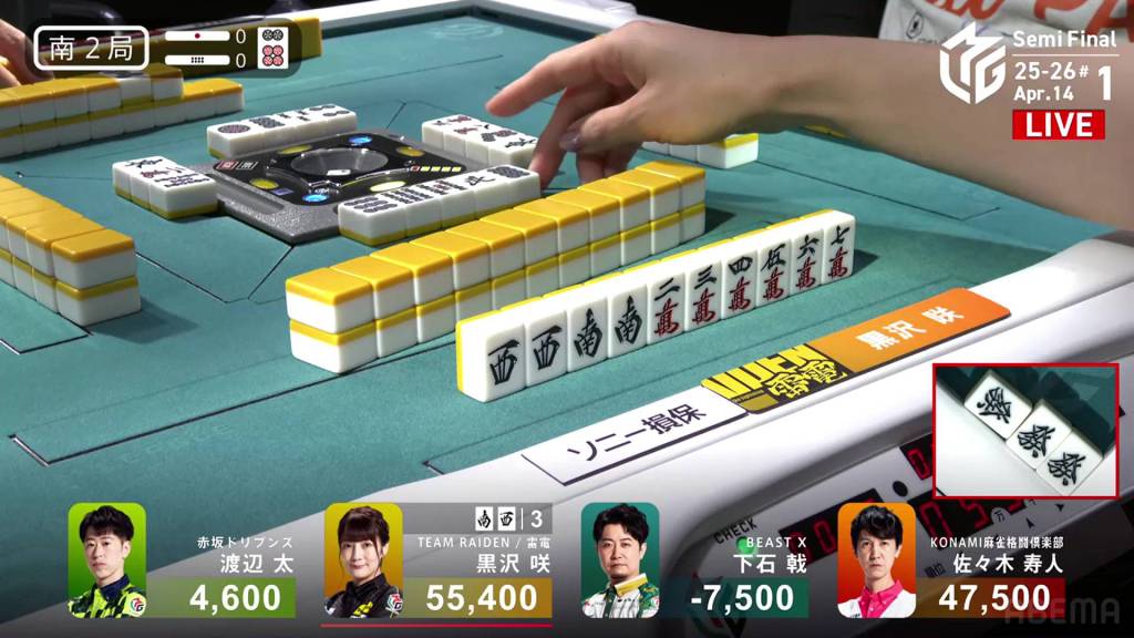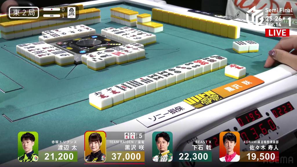 The danger for Kurosawa doesn’t last too long as she draws the south two turns later and wins the hand. Kurosawa wins with Honitsu/South/Green Dragon for 4,000 all.