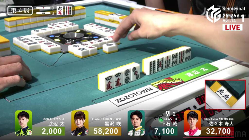 Holding one of those winning tiles is Futoshi, who is already folding, not wanting to deal in while in a precarious 3rd place.