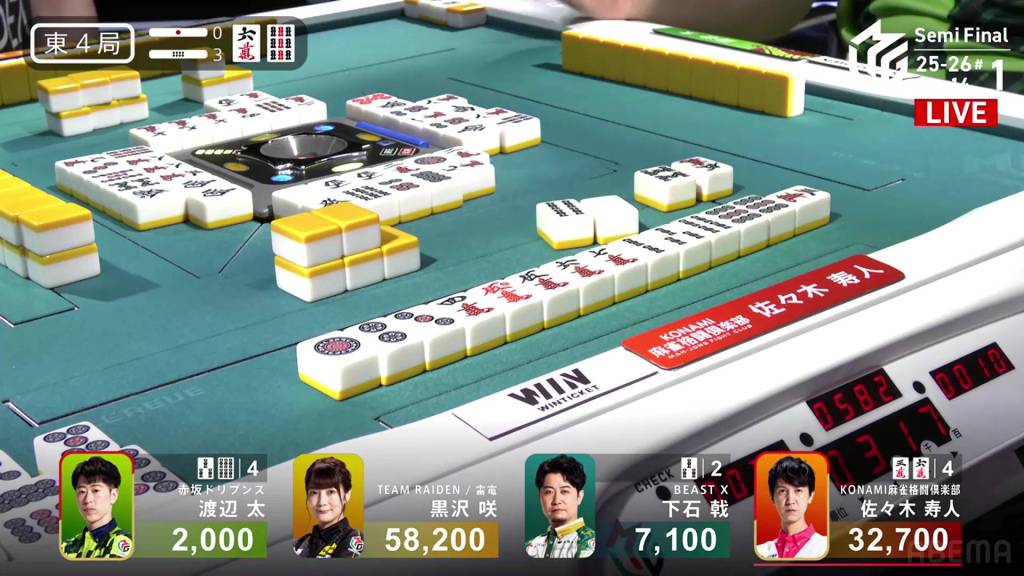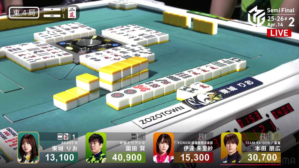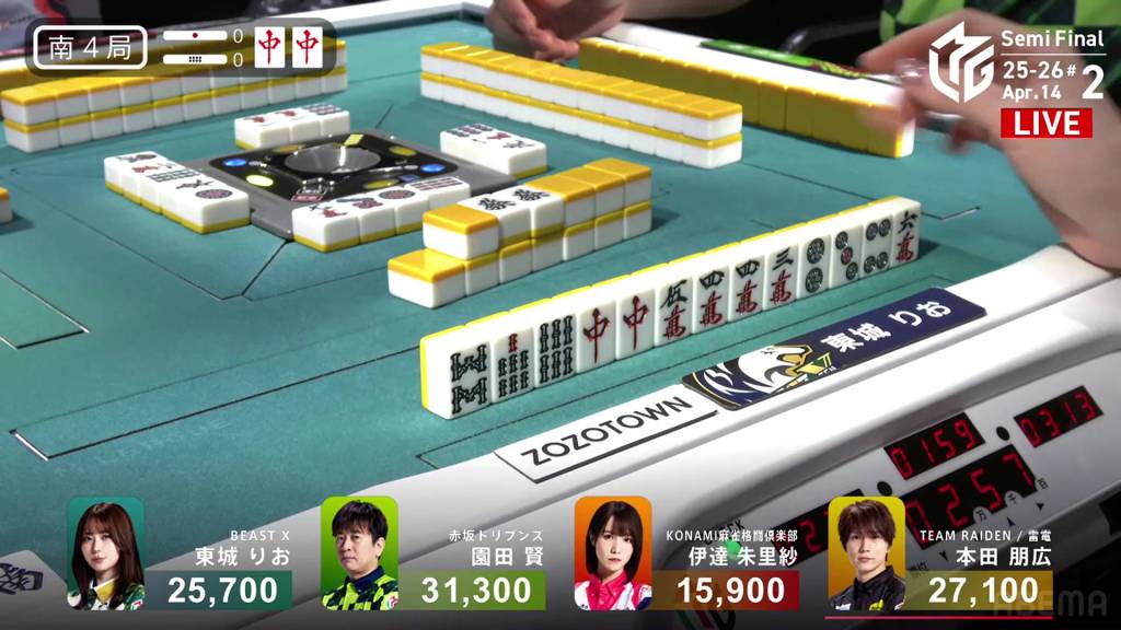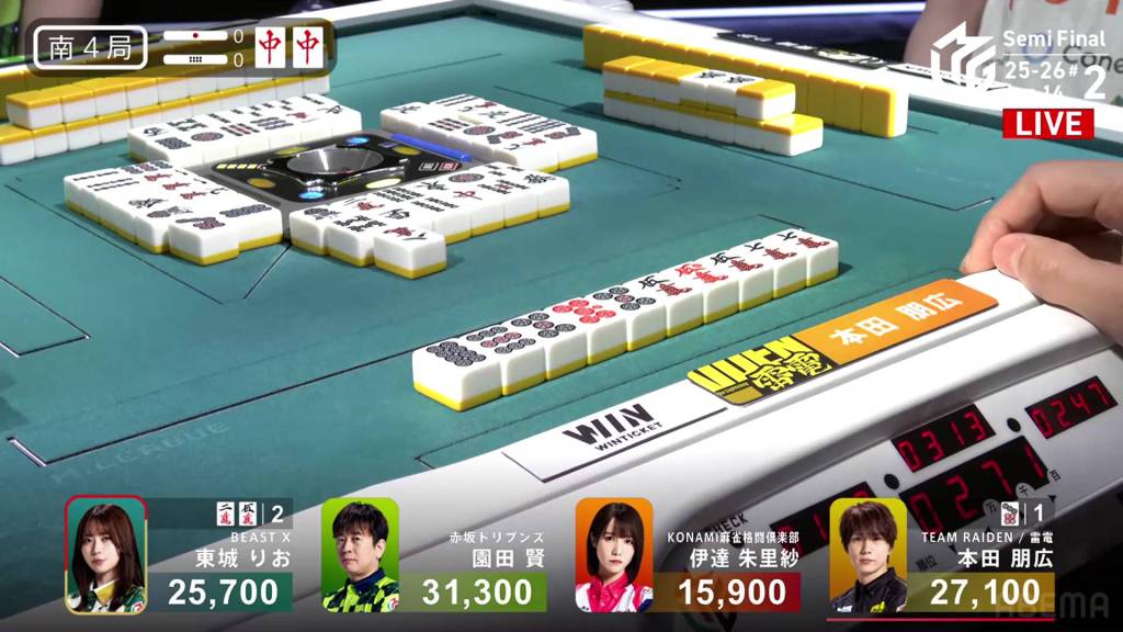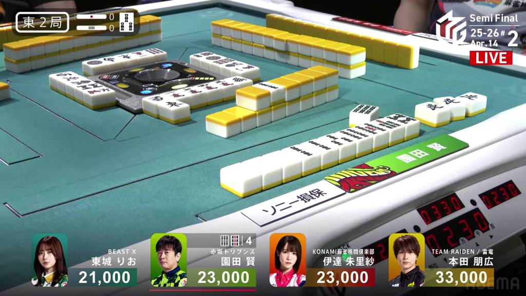 In S4-0, Honda is the last dealer in 2nd place, 4,200 behind 1st place Sonoda. He just needs a 3-han hand to move into 1st.