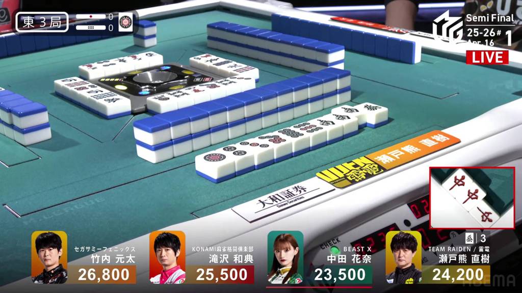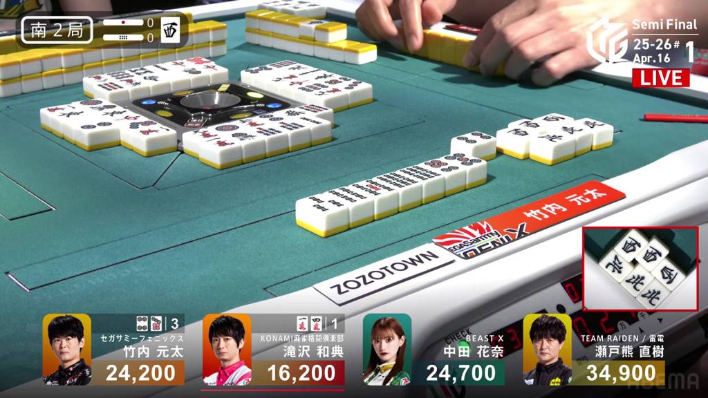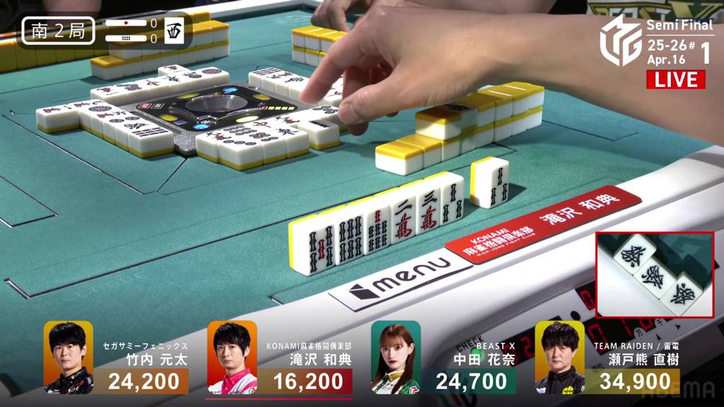 Within the go-around, Nakada discards the green dragon and deals into Setokuma. Setokuma wins the hand with Honitsu/Chanta/South/Red Dragon/Dora 1 for 12,000, moving into 1st place.