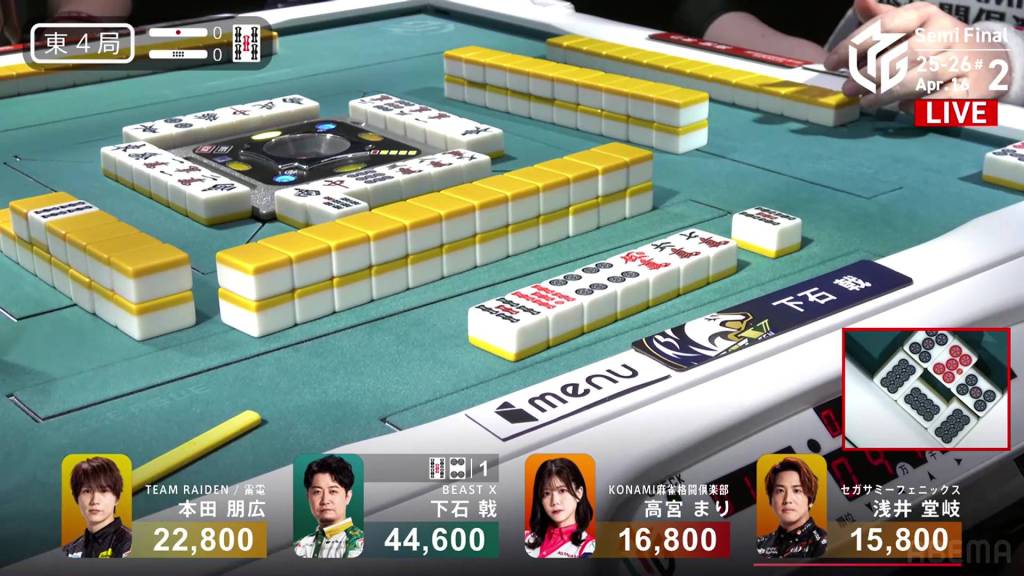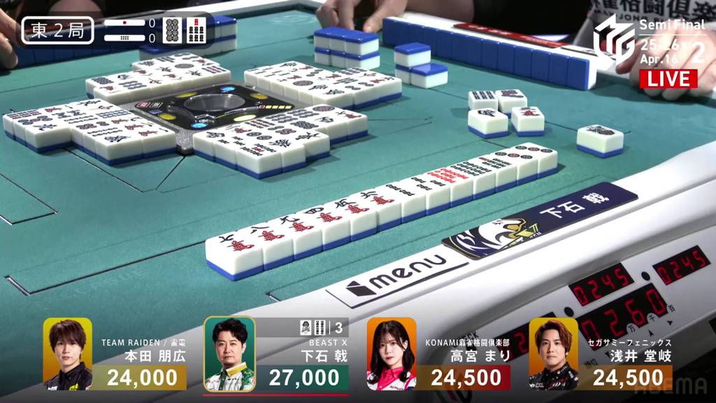 In E2-0, Shimoishi is the dealer in 1st place, holding a small lead after a 2/30 tsumo during the first hand.