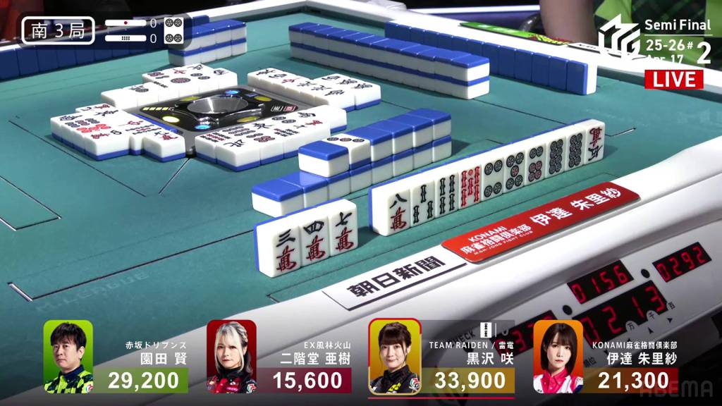 At the end of the row, Sonoda discards the 2s, the suji against Kurosawa’s 5s, and ends up dealing into the suji trap. With an uradora, Kurosawa wins with Riichi/Aka 1/Ura 1 for 7,700 plus a riichi sticks.