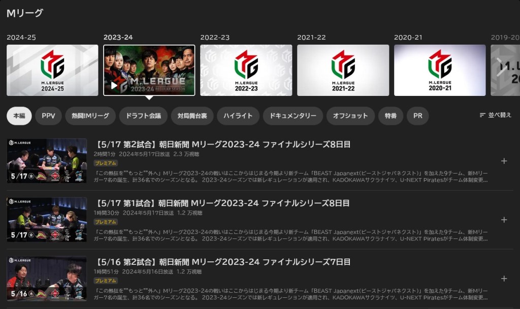 During the M-League season, games are typically broadcast on the ABEMA Mahjong Channel. All live games can be watched for free.