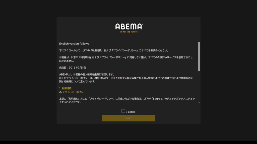 When visiting AbemaTV for the first time, you will be greeted with a terms and conditions and privacy policy screen. Scroll down to read the English version, click the box next to “I agree” and press the “Next” button.