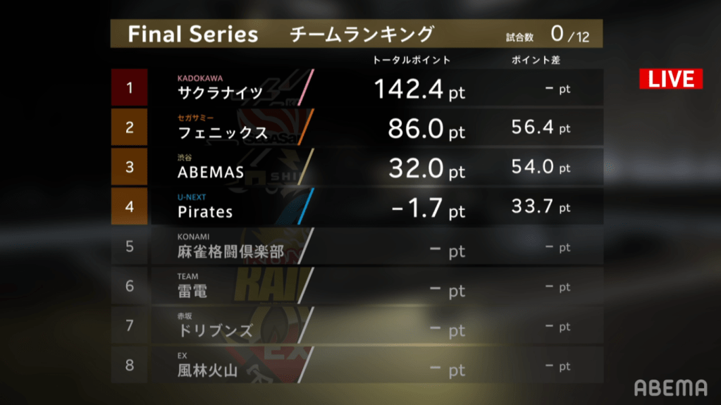 Kadokawa Sakura Knights were in the lead with 142.4pts, with the Sega Sammy Phoenix within striking distance of the lead with 86.0pts. Though the Shibuya Abemas and the U-Next Pirates were at 32.0pts and -1.7pts respectively, they still posed a threat with the final being 12 games.