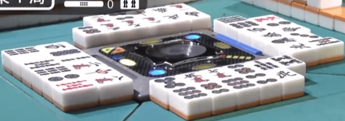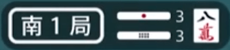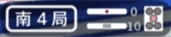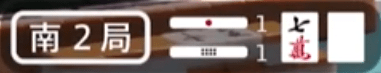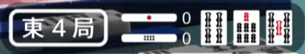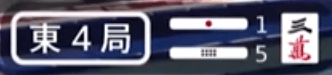 On the left side, you will see something like (南4局) or (東1局). The first character indicates what the round wind is. It will either be 東 (East) or 南 (South). The number indicates how far into the round the game is (to show whether it’s the 1st, 2nd, 3rd or 4th dealer). The character 局 is the Japanese character for round. Typically, you will see it shortened to E1-# or S1-# in articles, with the letter indicating the round and the number immediately after indicating the round (the # will be explained a bit later)